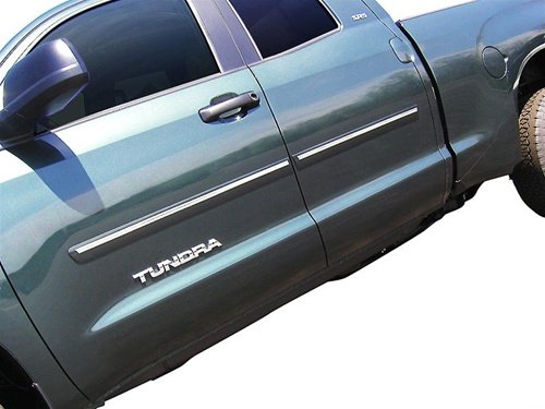 FeaturesProtect your Toyota Tundra from shopping carts, door dings, scratches and other road hazards.Easy-to-install, no drill, Self-Adhering Body Side Molding Kit.5-Year/50,000 mile warranty.Guaranteed to match the color of your Tundra precisely.Add style and protection to your Toyota Tundra today by adding a Body Side Molding Kit! 2007-2013 Toyota Tundra Double Cab Body Side Moldings (Indigo Ink Pearl 8P4) with Chrome Insert?